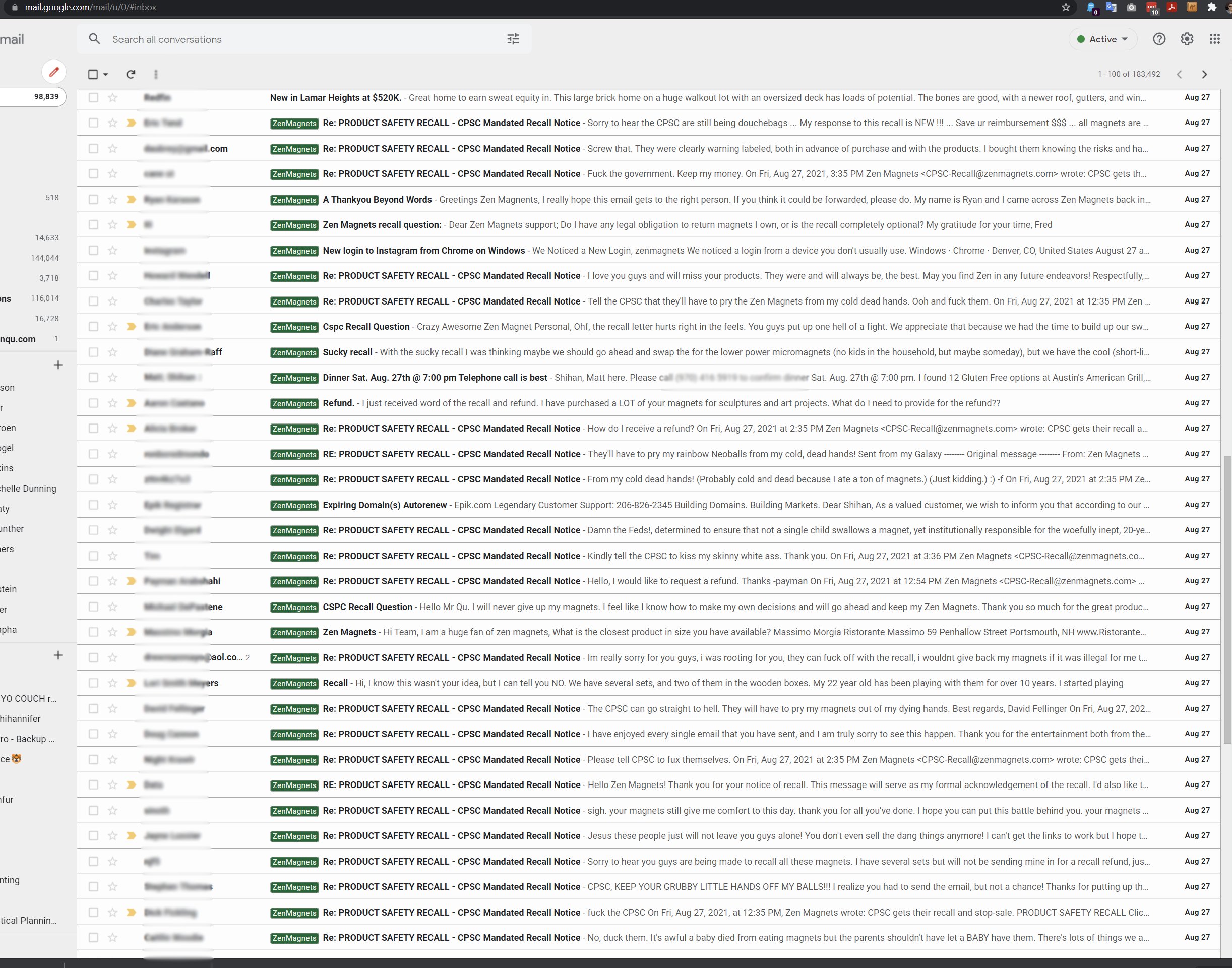 To my recollection, I’ve been waiting over a month for y’all to decide whether you wanted a recall, or dissolution/bankruptcy proceedings from Zen by requesting Zen’s compliance outside of it’s financial capabilities. E.g, insisting that we send multi-page first class letters to the tens of thousands who have ever purchased Zen Magnets.